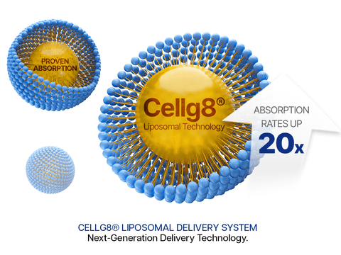 CELLg8® 脂質體穀胱甘肽可增強吸收(比標準 L-穀胱甘肽好 20 倍),從而改善抗氧化防禦、支持排毒並促進整體健康。